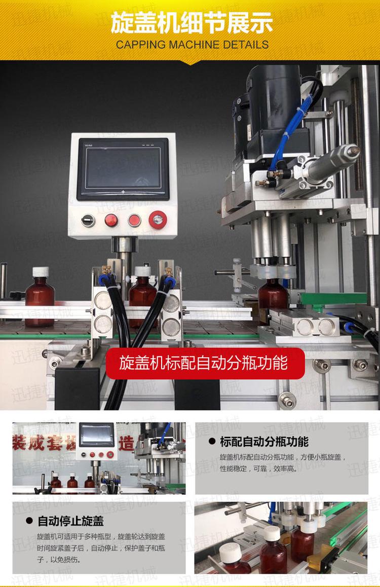 旋蓋優(yōu)勢(shì)有:旋蓋機(jī)擁有做到自動(dòng)分瓶功能,當(dāng)瓶蓋旋緊時(shí)可自動(dòng)停止旋蓋,保護(hù)了蓋子和瓶子免受損傷。塑料瓶消毒水灌裝機(jī)(小玻璃瓶溶液灌裝機(jī))整機(jī)由304不銹鋼材質(zhì)組成,灌裝效率和精度高,雙重保證您的物料的包裝效果。