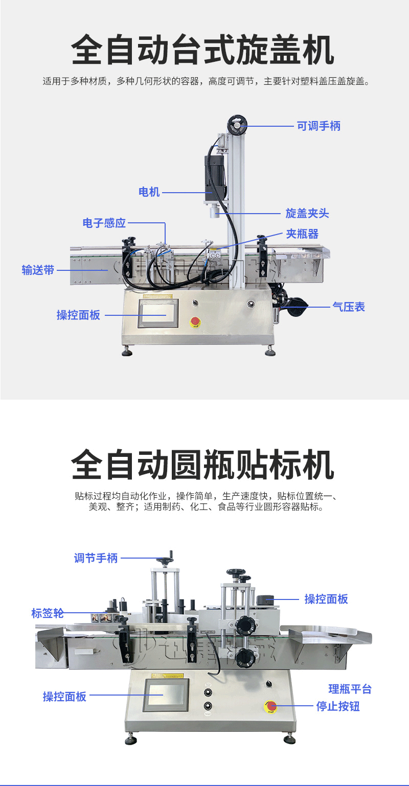 產(chǎn)品說(shuō)明:桌面型膏液灌裝生產(chǎn)線根據(jù)灌裝范圍選擇型號(hào),灌裝部分為雙頭下潛式灌裝機(jī),適用于不同物料不同瓶子的灌裝,配備自動(dòng)壓蓋機(jī)和圓瓶貼標(biāo)機(jī),可實(shí)現(xiàn)不同蓋子的旋蓋貼標(biāo)工作。